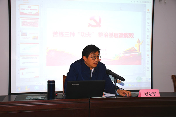 近日,为强化党员干部责任意识、担当意识、底线意识、纪律意识,结合生态文旅区党员冬训活动,市委巡察办副主任、生态文旅区纪工委负责人刘永军到福地路办事处为办事处机关及村居党员干部作了题为"苦练三种‘功夫’ 整治基层微腐败"为主题的廉政党课。党课围绕整治群众身边的腐败问题对新城加快发展的重要意义、打铁需要自身硬等方面,用身边的事例教育身边人,提出基层党员干部要做到廉洁自律、把握好自己,必须练好思想上的"内功"、守住廉洁自律的"防功"、划清公与私的"硬功"等"三种功夫"。